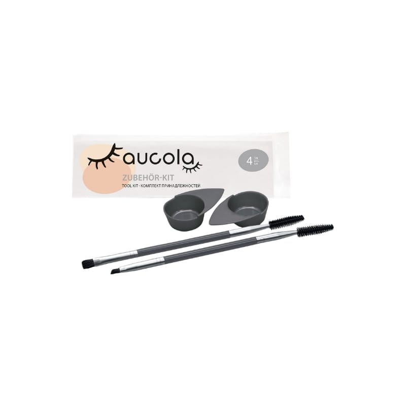AUCOLA TOOL KIT – ovaj set dodataka sastoji se od 2 kombinirane četke i 2 mini zdjelice za bojenje. Vrhovima četki može se češljati kosa. Uska, nagnuta četka idealna je za detaljan rad i preciznu primjenu. Široka četka omogućava brzo nanošenje boje na obrve i obojene trepavice.